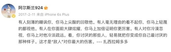 能够不受外界干扰,默默提升自己,单就这一点已经跑赢了联赛大部分球员。直到今天,阿尔斯兰微博的置顶仍然是2017年用iPhone6s Plus发布的一条激励自己的箴言。