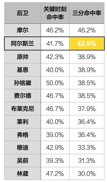 而在关键时刻,阿尔斯兰的整体运动战命中率排在联盟第11,其中三分命中率在后卫位置上仅次于龙狮队小外援摩尔。
