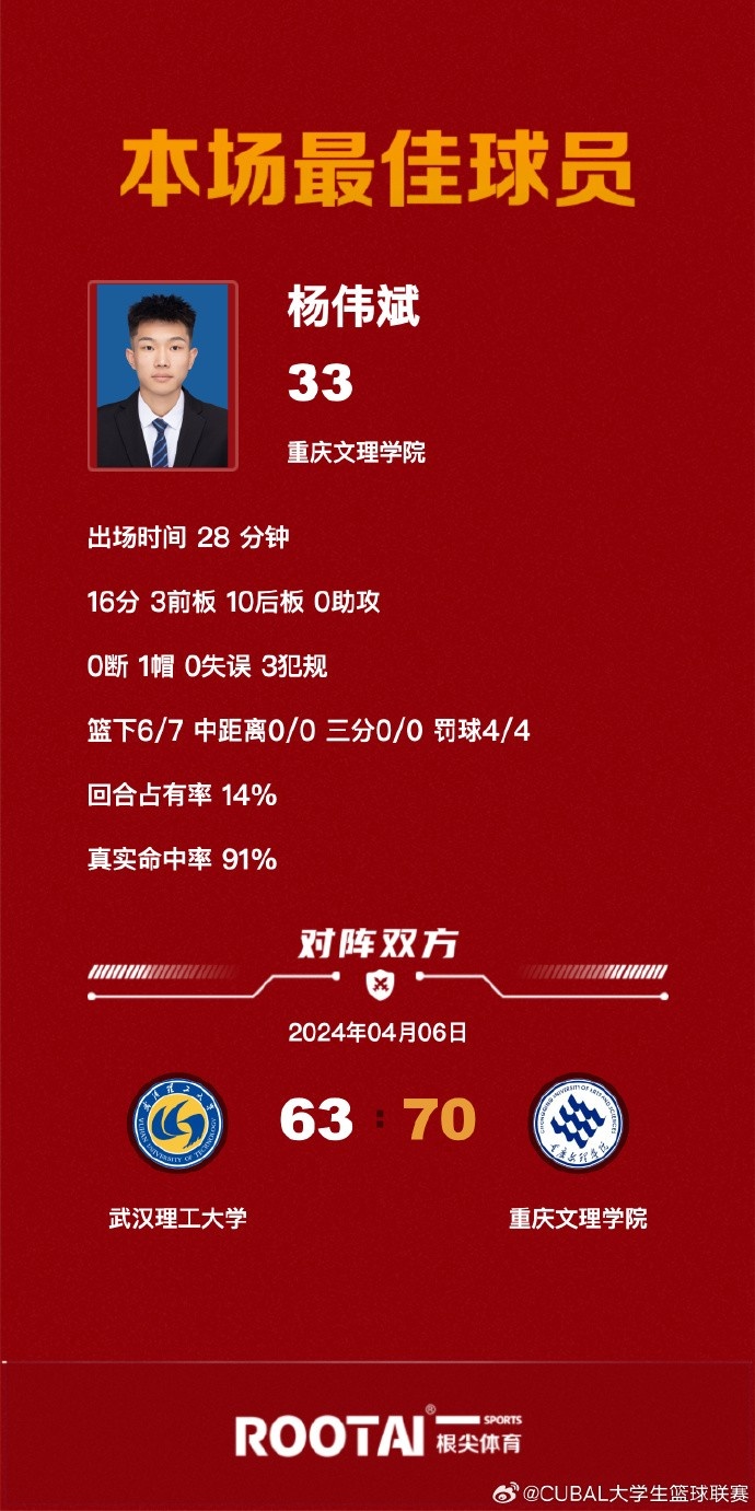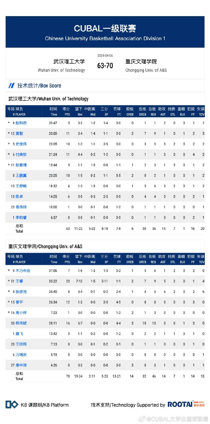 末节决战,王睿内线自投自抢打成,曾宇内线强打2+1后外线三分再进,重庆文理一波10-2拉开10分领先,史佳伟再止血,但木乃布合三分回应,重庆文理还是保持双位数领先,黄智三分止血后,王鹏翼三分加反击2+1追到差2分,随后武汉理工接连机会把握不住并连续失误,杨伟斌和王睿接连2+1杀死比赛,最终重庆文理70-63力克武汉理工。