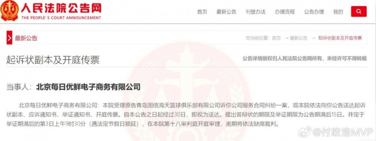 4月29日消息 据媒体人付政浩报道,青岛男篮起诉了他们在2020-2021赛季的冠名赞助商每日优鲜。