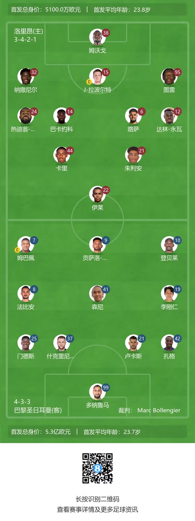 巴黎首发:99-多纳鲁马、42-扎格、21-卢卡斯-埃尔南德斯、37-什克里尼亚尔、25-努诺-门德斯、8-法比安、19-李刚仁、41-马尤卢、10-登贝莱、7-姆巴佩、9-贡萨洛-拉莫斯