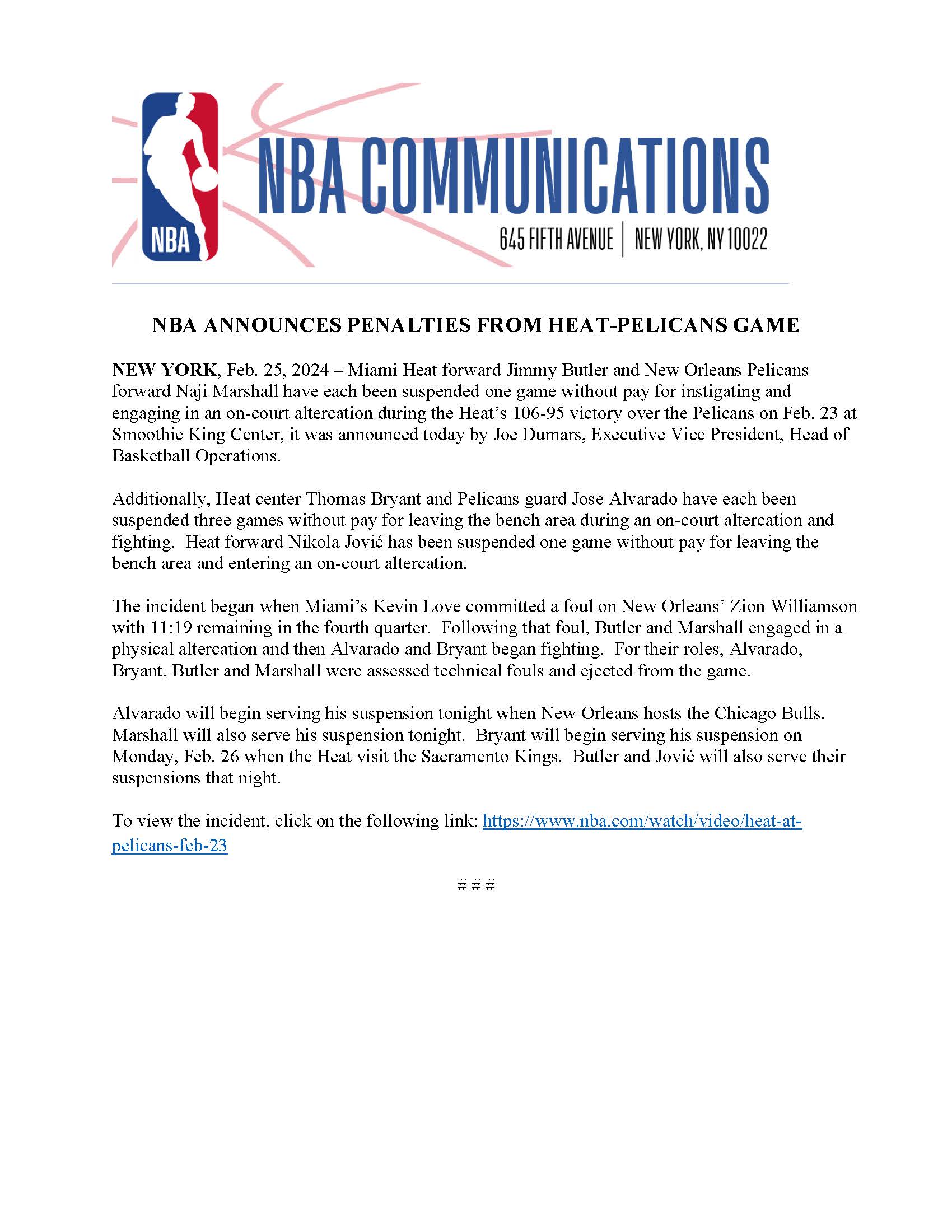 02月26日消息 NBA官方公布了热火和鹈鹕冲突的处罚结果:巴特勒、马绍尔禁赛1场,约维奇停薪禁赛1场,阿尔瓦拉多和托马斯-布莱恩特停薪禁赛3场。