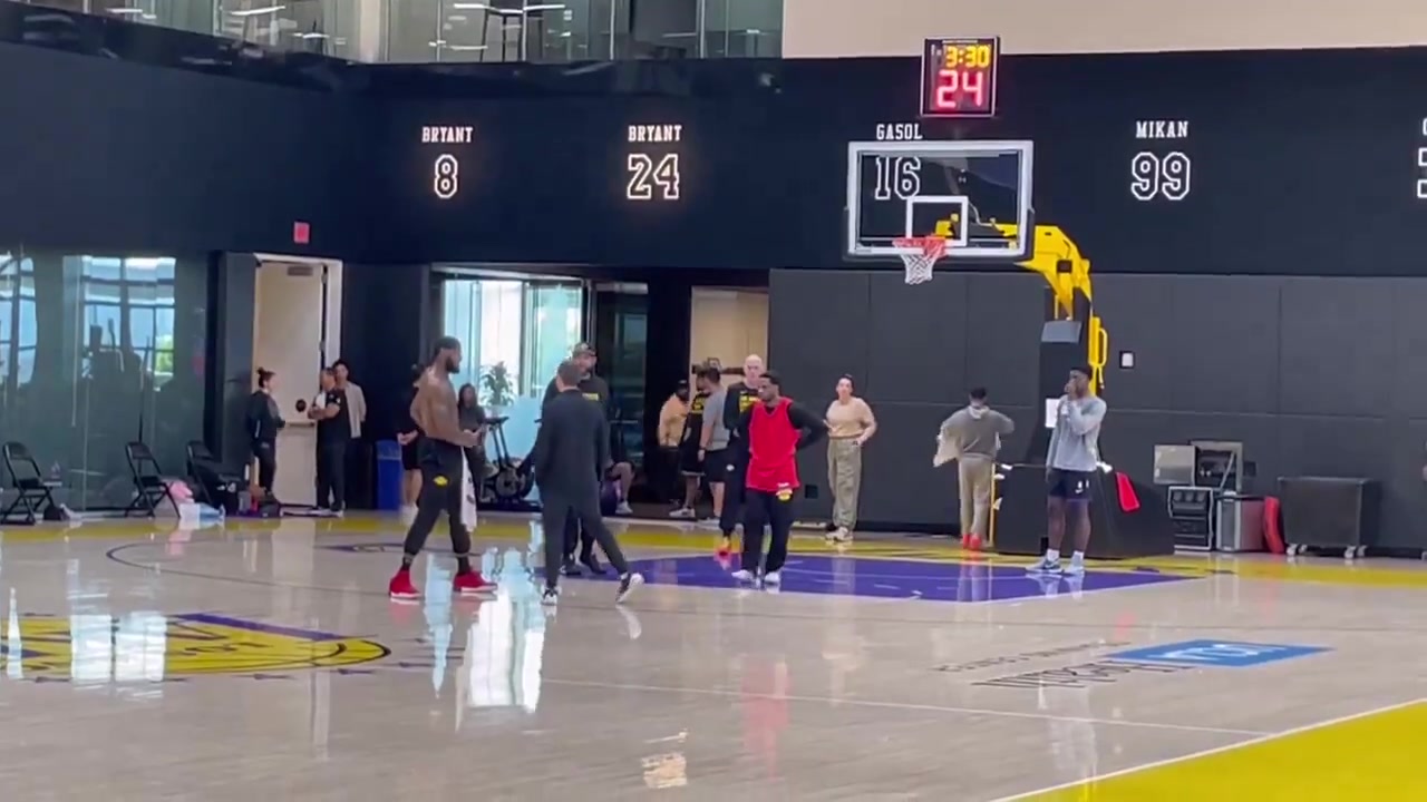 专注力!詹姆斯在今天训练中与哈姆及教练组积极讨论防守站位!