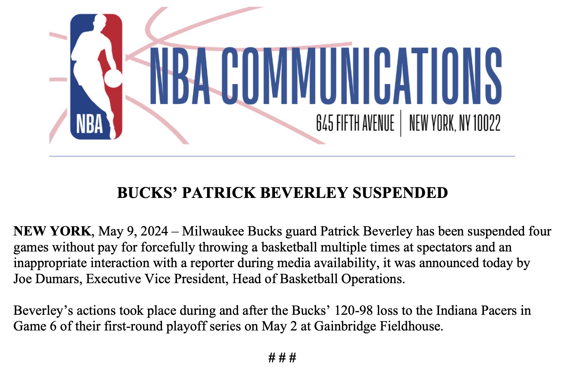 ????官方:贝弗利被停薪禁赛4场 因其多次用球砸球迷+对记者不敬