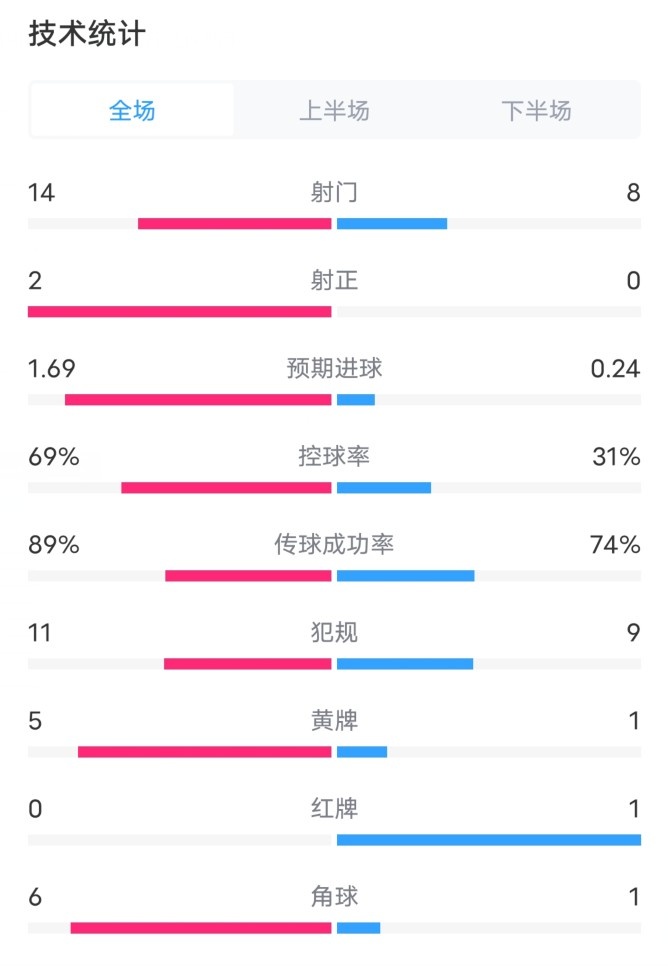 巴萨VS拉斯帕尔马斯全场数据:射门14-8、控球率69%-31%