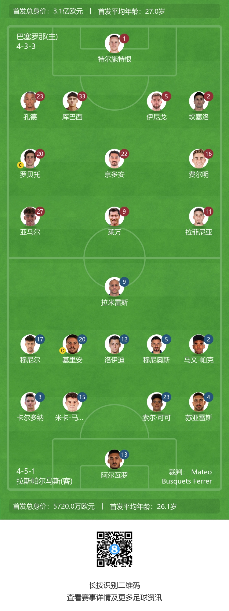 巴萨首发:1-特尔施特根、2-坎塞洛、5-伊尼戈-马丁内斯、23-孔德、33-库巴西、20-罗贝托、22-京多安、16-费尔明、9-莱万、11-拉菲尼亚、27-亚马尔