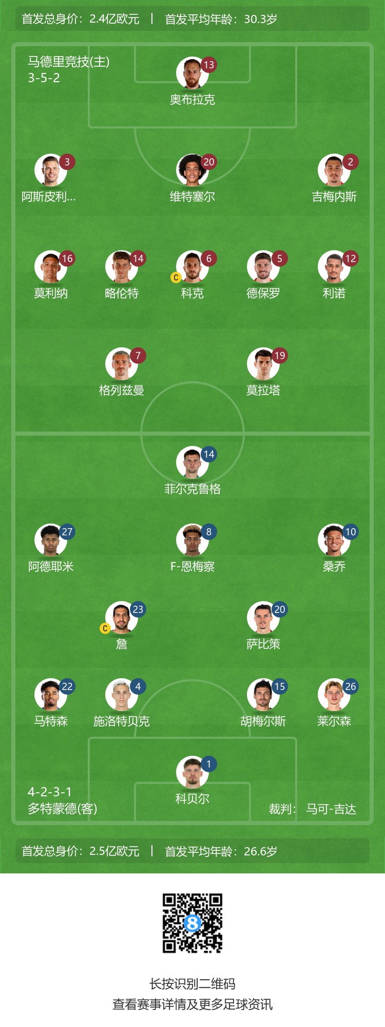 马竞首发:13-奥布拉克、12-利诺、2-吉梅内斯、20-维特塞尔、3-阿兹皮利奎塔、16-莫利纳、14-马科斯-略伦特、5-德保罗、6-科克、7-格列兹曼、19-莫拉塔
