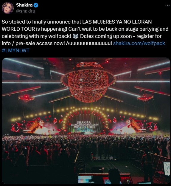 而今天,夏奇拉也宣布新专辑配套的世界巡演即将开始,她写道:“很兴奋地宣布,《女人不再哭泣》世界巡演终于要开始了!迫不及待地想回到舞台上,与我的狼群一起狂欢庆祝!巡演日期即将公布!”