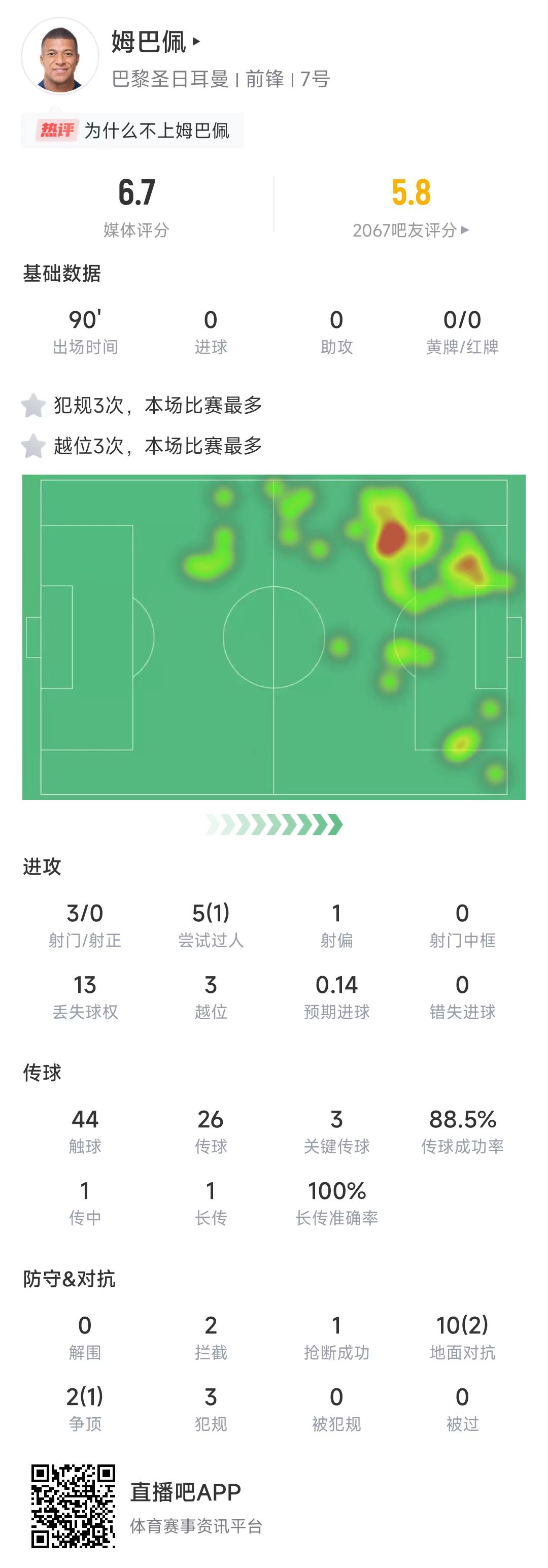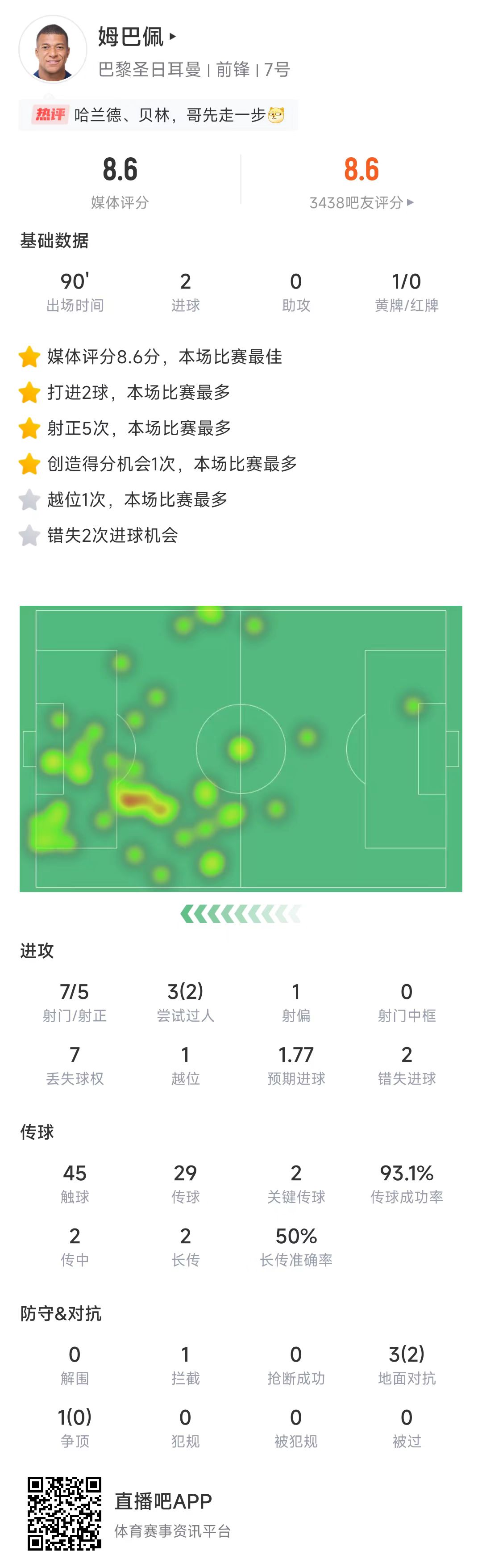 0球→2球!姆巴佩两回合对比:3射0正→7射5正,评分倒数→第一