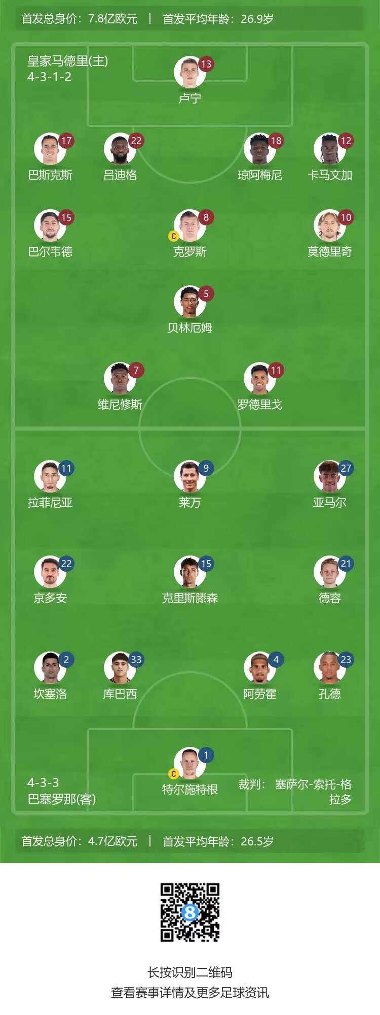 4月22日消息 西甲第32轮,皇马主场对阵巴萨。赛前,官方公布了本场的首发名单。