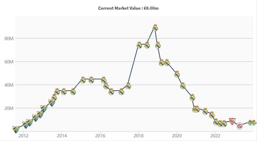 伊斯科在皇马度过自己的巅峰时期,彼时的他是皇马欧冠三连的主力之一,后两次连冠的决赛,他都是首发。在2018年,他的巅峰身价也一度达到了9000万欧。