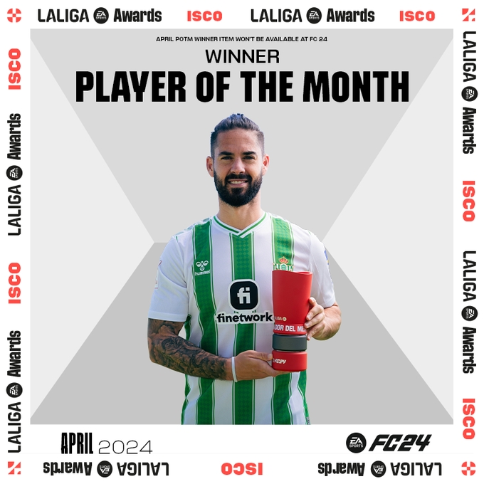 出战3次贡献1球1助攻!官方:伊斯科当选西甲4月最佳球员