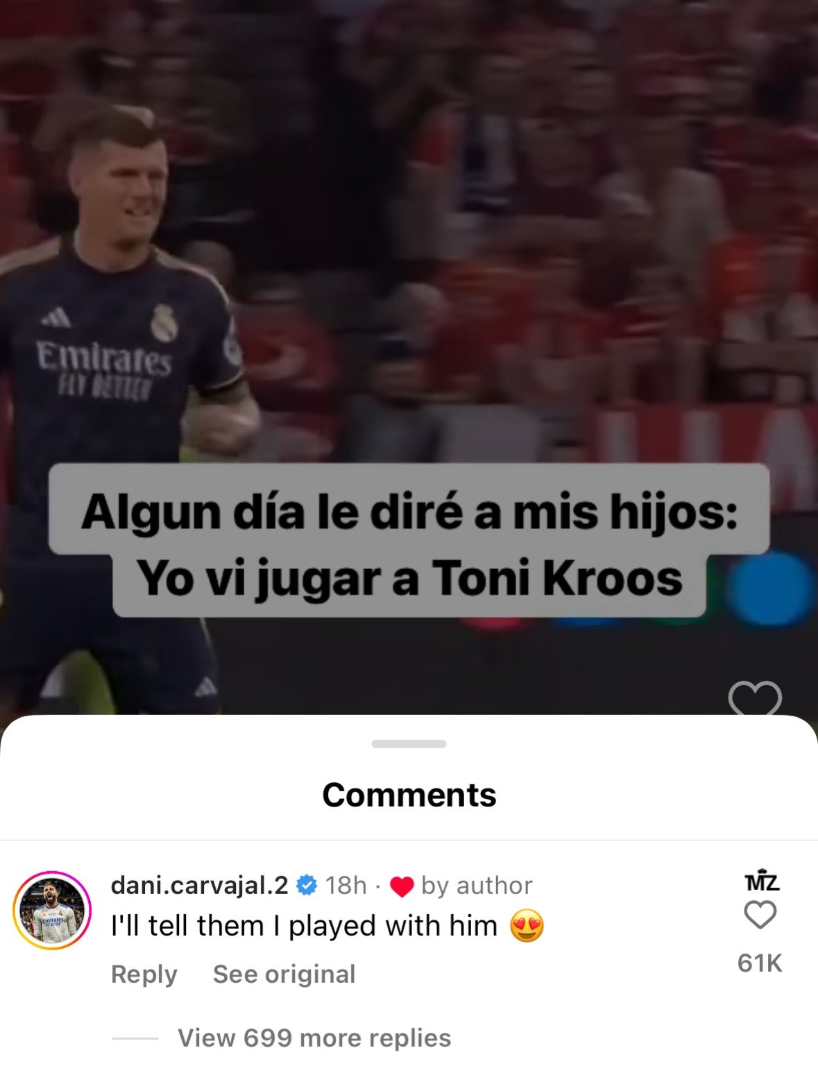 卡瓦哈尔评论球迷社媒:有一天我会告诉孩子,我和克罗斯踢过球