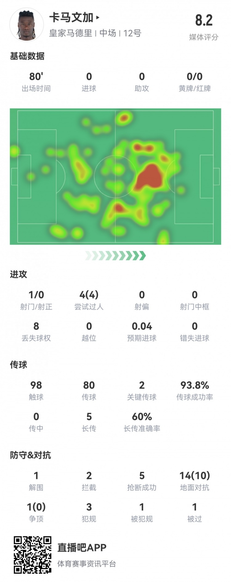 卡马文加数据:传球成功率94%,2次关键传球,4次过人全部成功