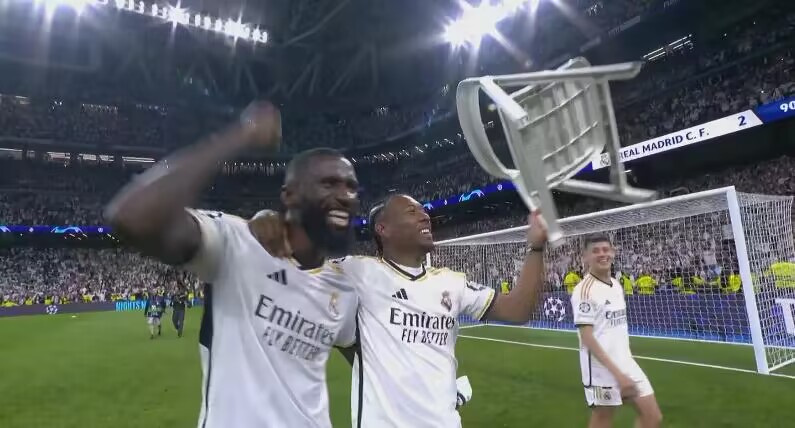 兴奋不已????皇马成功晋级决赛,阿拉巴举起椅子庆祝