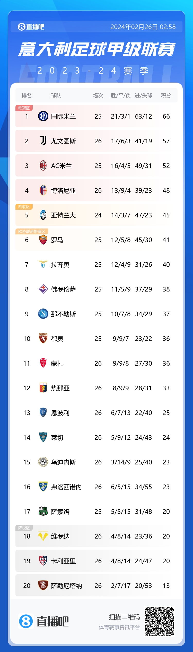 意甲积分榜:国米联赛7连胜&连续19轮不败,少赛1轮领先尤文9分