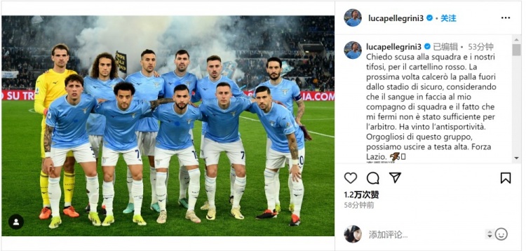 卢卡-佩莱格里尼:我为红牌道歉,米兰以违反体育精神方式取胜