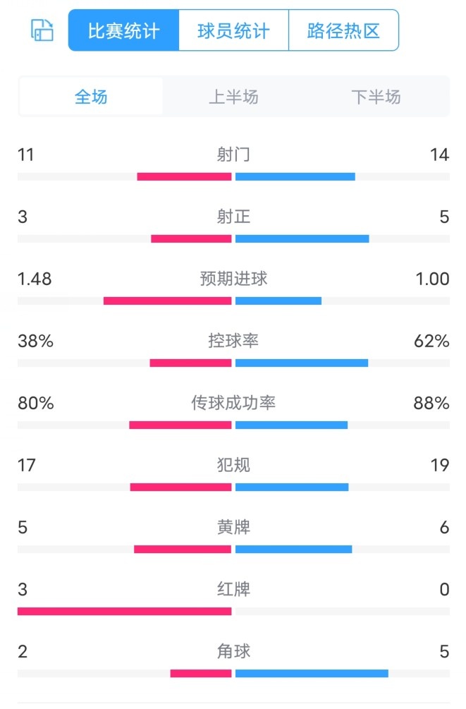 拉齐奥VS米兰全场数据:射门11-14,控球率38%-62%,红牌3-0