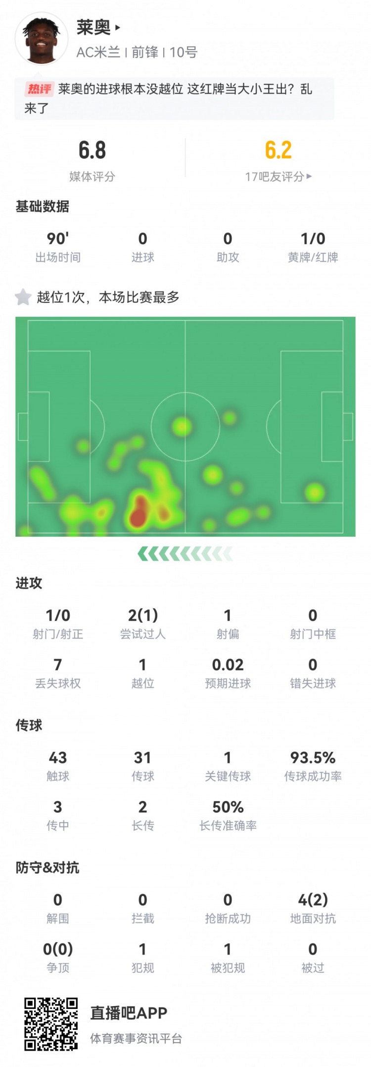 体毛越位被吹!莱奥数据:2过人1成功1次关键传球 评分6.8