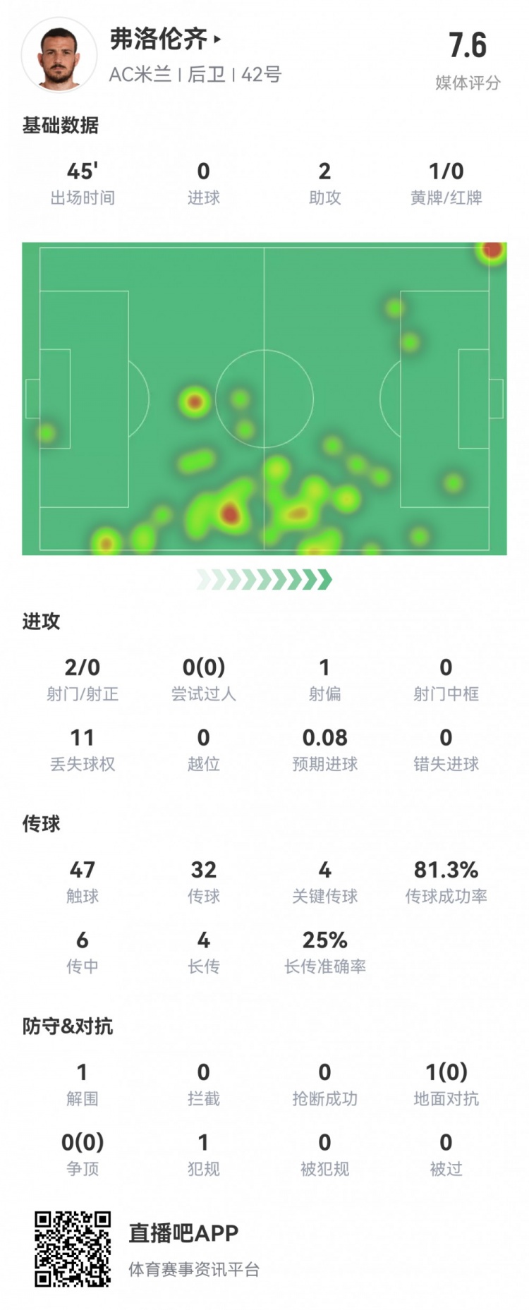 半场下班!弗洛伦齐本场数据:半场末2分钟2助攻,评分7.6分