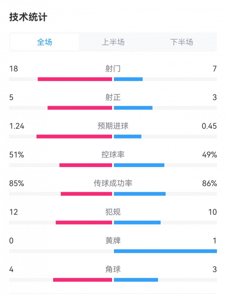 尤文2-2亚特兰大全场数据对比:射门18-7,射正5-3,犯规12-10