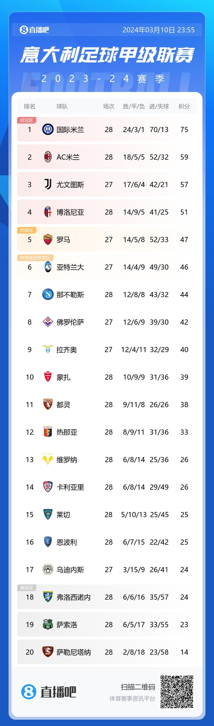 意甲积分榜:米兰超尤文2分暂升第二,榜首国米16分优势领跑