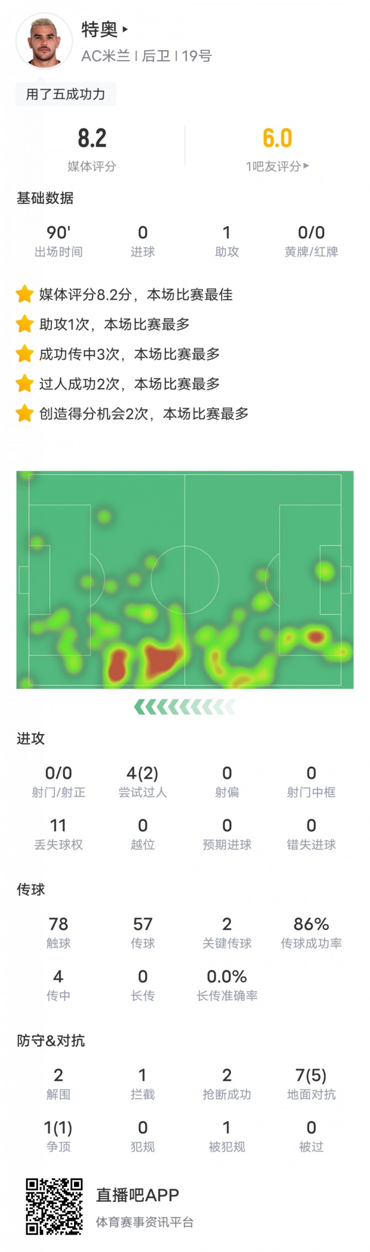 特奥本场比赛数据:1助攻2关键传球2过人成功,评分8.2全场最高