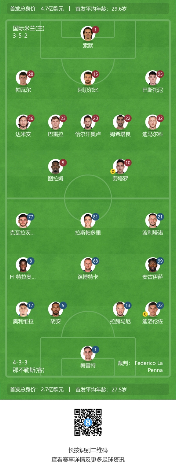 国米vs那不勒斯首发:劳塔罗搭档图拉姆,恰20先发,奥斯梅恩替补