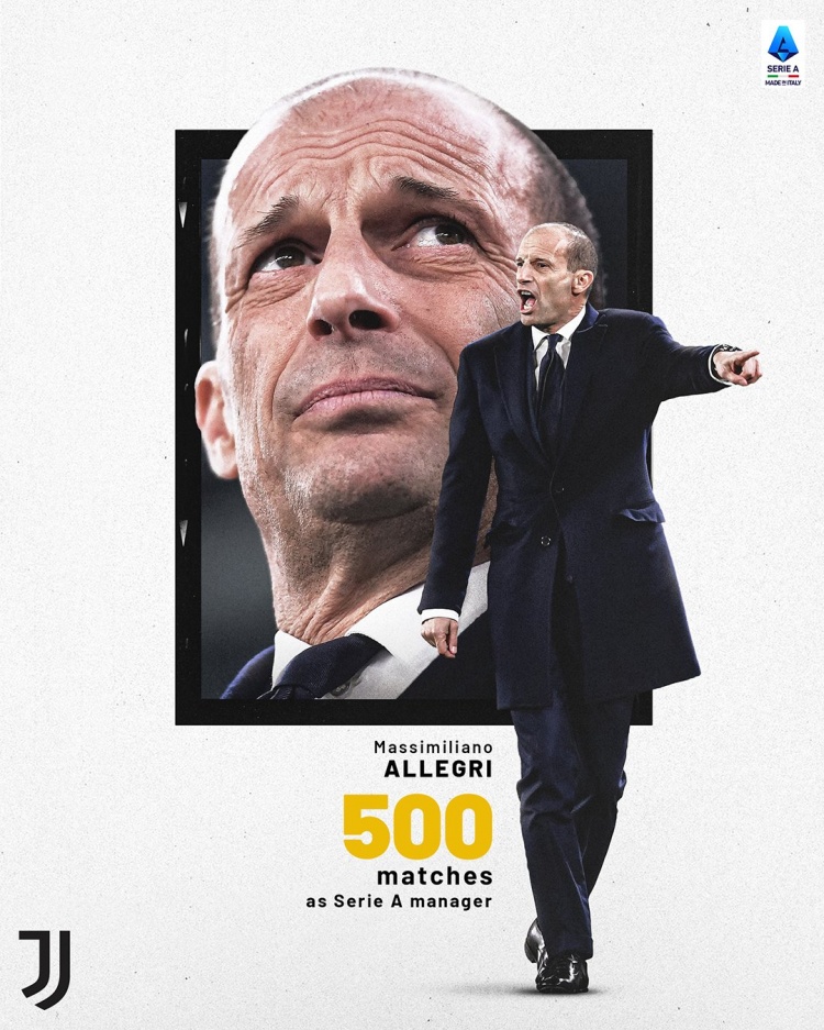 阿莱格里迎来意甲执教500场里程碑,此前301胜101平97负+6次夺冠