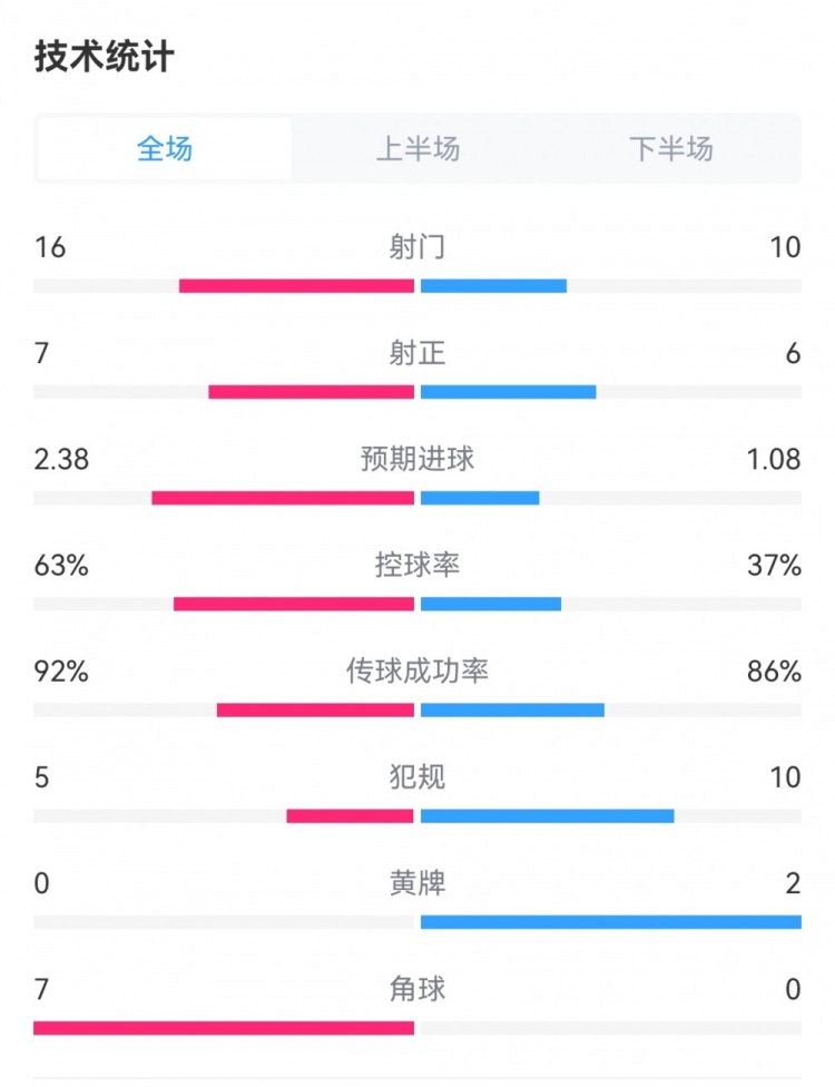 国米2-2卡利亚里数据:射门16-10,射正7-6,预期进球2.38-1.08