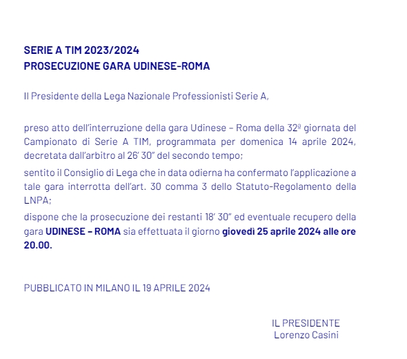 ????从72分钟开踢!官方:乌迪内斯vs罗马比赛将在4月26日继续进行