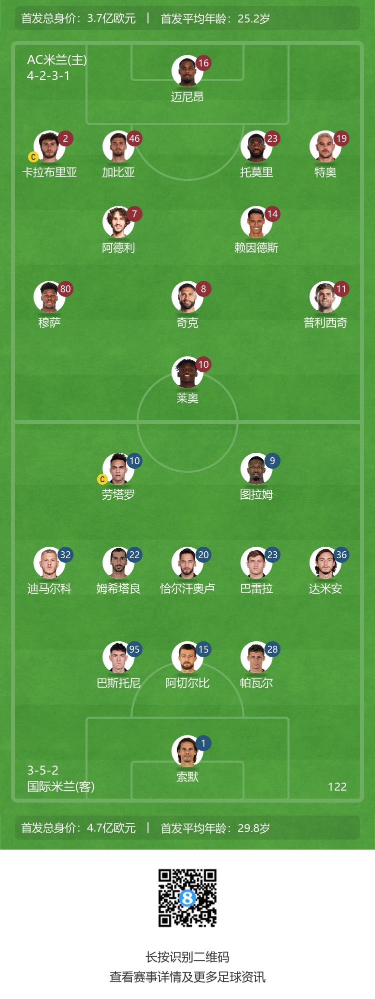 米兰替补:57-斯波蒂耶洛、69-拉波-纳瓦、4-本纳塞尔、9-吉鲁、15-约维奇、17-奥卡福、21-丘库埃泽、30-卡尔达拉、38-泰拉恰诺、42-弗洛伦齐