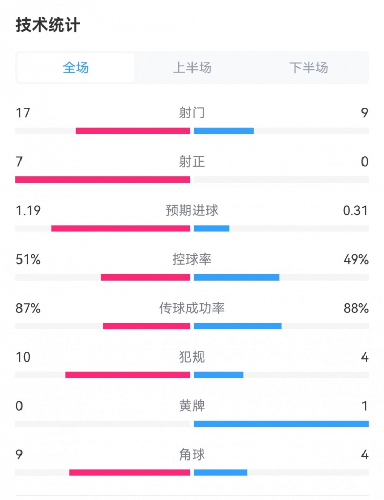 尤文0-0米兰全场数据:射门17-9,射正7-0,预期进球1.19-0.31