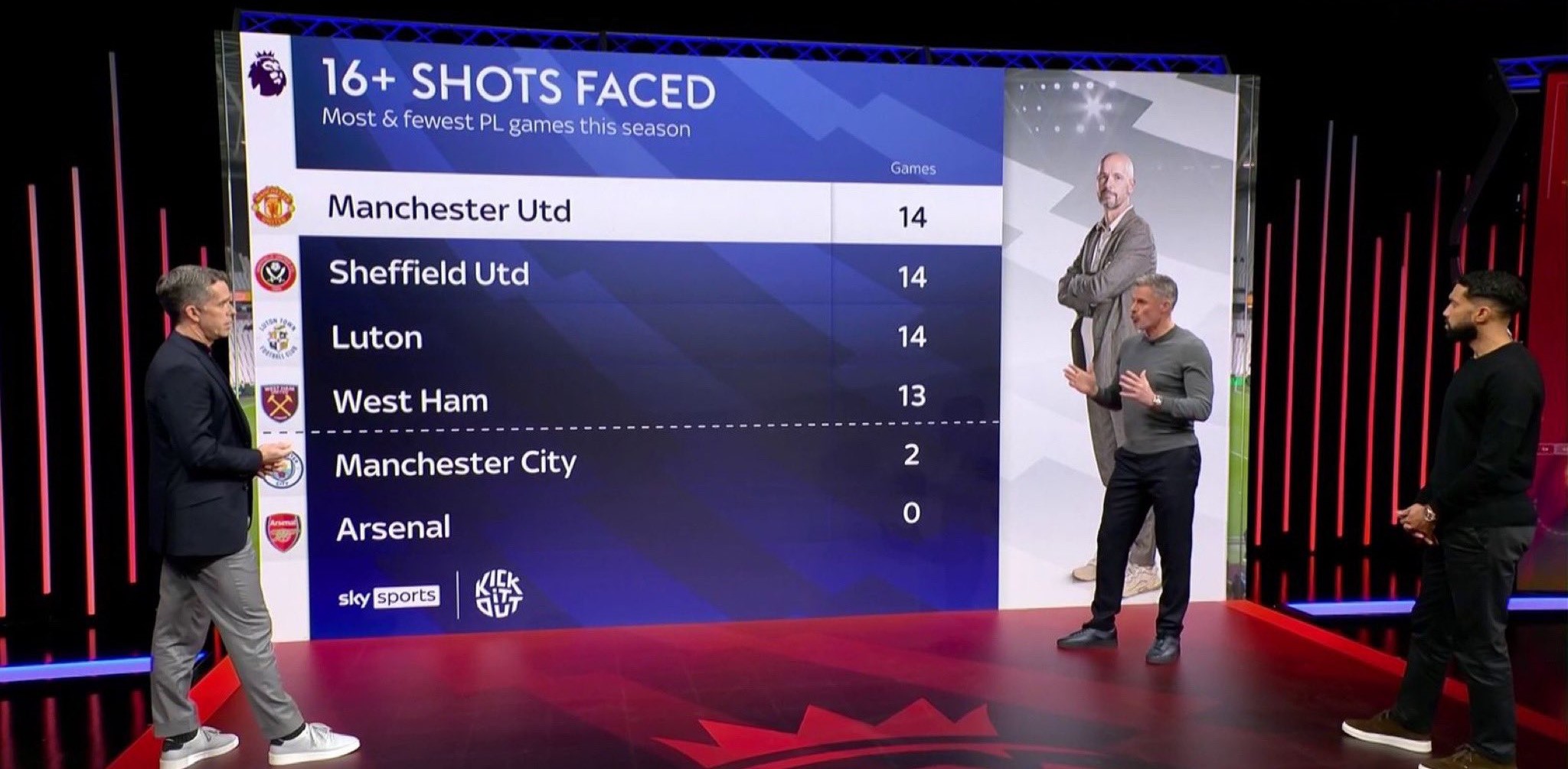 滕氏曼联64场英超12场被射门20+,本赛季14场被射门16+并列最多