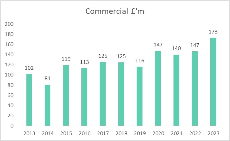 阿森纳在2022-23赛季的商业收入达到了创纪录的1.73亿英镑,但与其他BIG6俱乐部仍有较大差距,切尔西的商业收入为1.77亿英镑,热刺为1.84亿英镑,利物浦为2.47亿英镑,曼联为3.03亿英镑,曼城为3.41亿英镑。