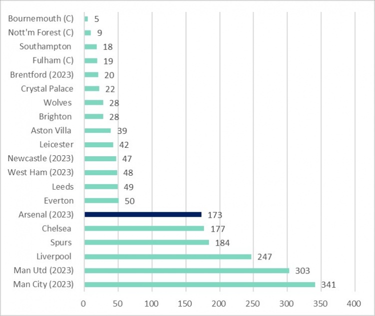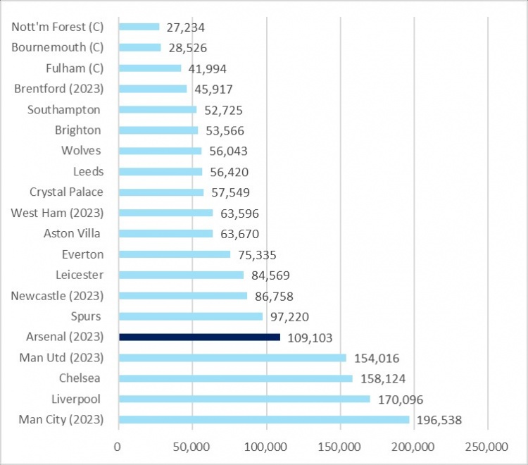 由于在英超联赛中有着更高的排名(每个位置价值310万英镑)和参与欧战,阿森纳在2022-23赛季的转播收入达到了1.91亿英镑,涨幅高达31%。