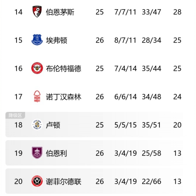 在埃弗顿拿回4个积分后,他们目前积25分排在英超第15位,以净胜球优势反超布伦特福德。布伦特福德现在领先降级区5分。