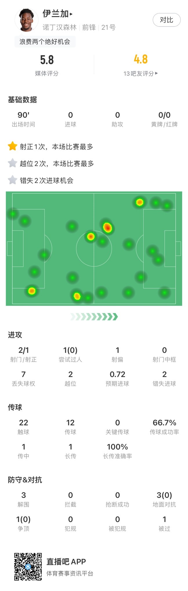 伊兰加全场数据:评分5.8全场最低,错失2个进球&丢失球权7次