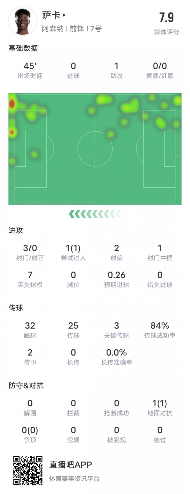 萨卡本场比赛数据:1助攻1中框1过人成功3关键传球,评分7.9