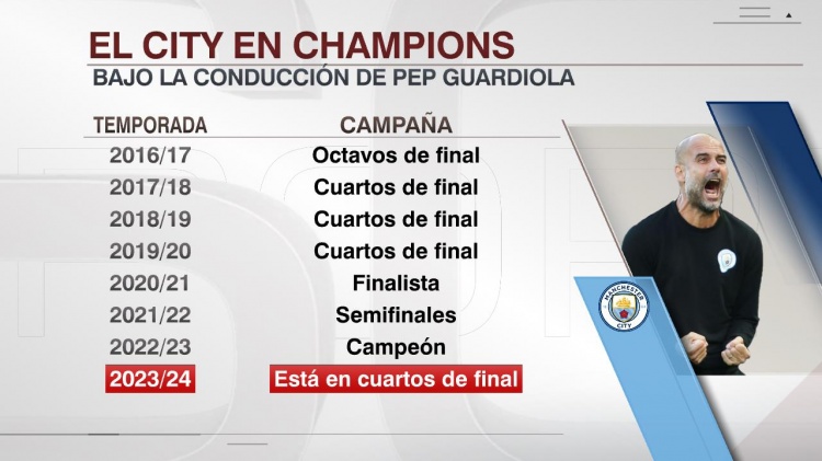 瓜帅带领曼城连续7年晋级欧冠8强,过去3个赛季1冠1亚