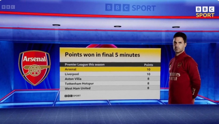 本赛季英超最后5分钟抢分排名:阿森纳、利物浦10分最多