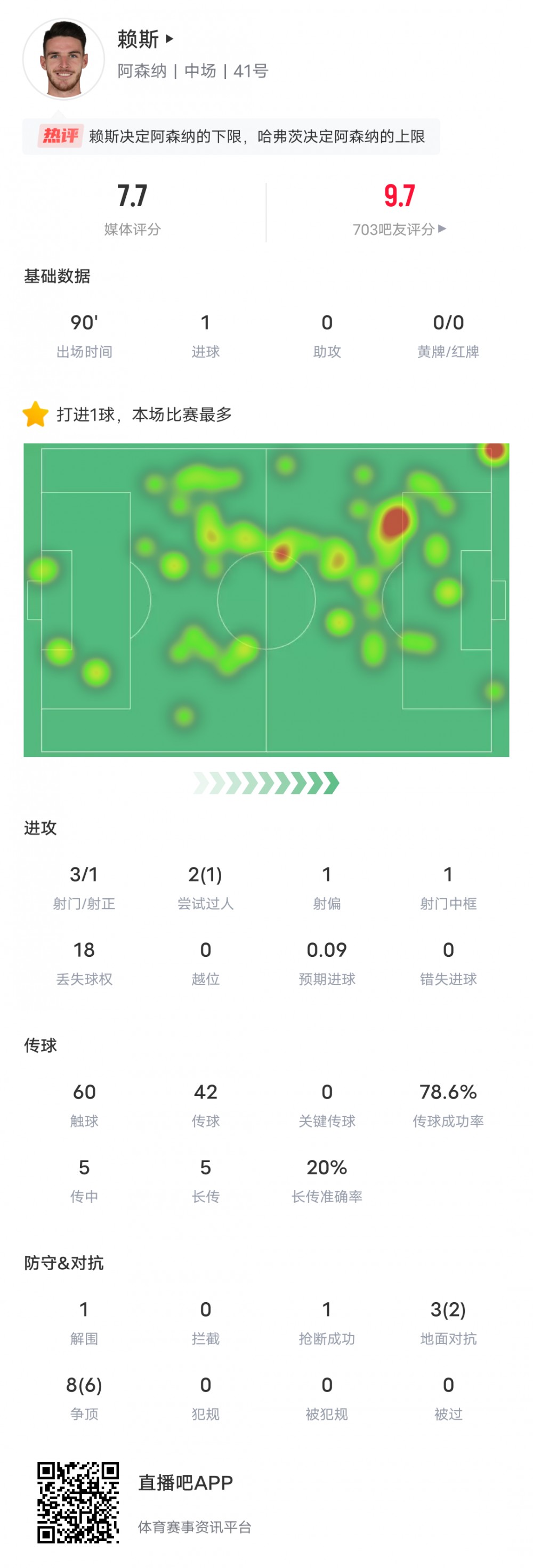 赖斯本场数据:1进球,8次争顶6次成功,3次对抗2次成功,评分7.7