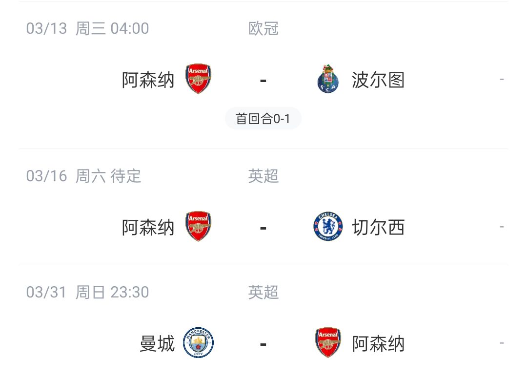 连场硬仗!阿森纳周中主场欧冠战波尔图,月底客战争冠对手曼城