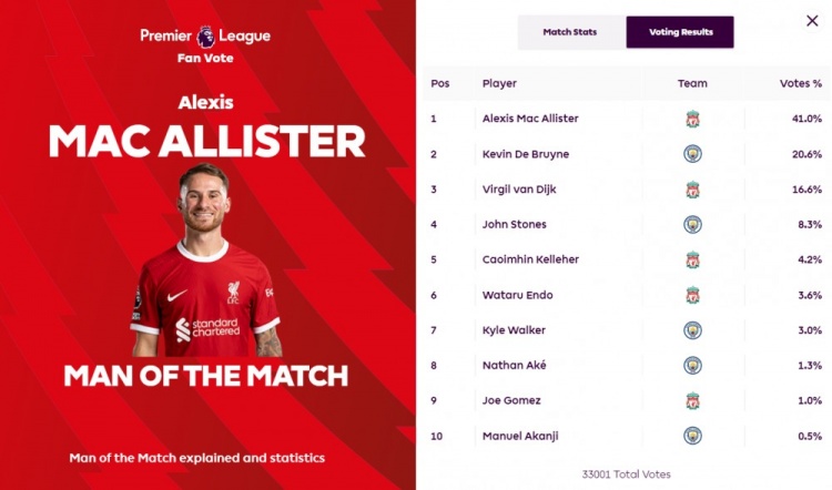 点射扳平比分,麦卡利斯特当选利物浦1-1曼城全场最佳球员