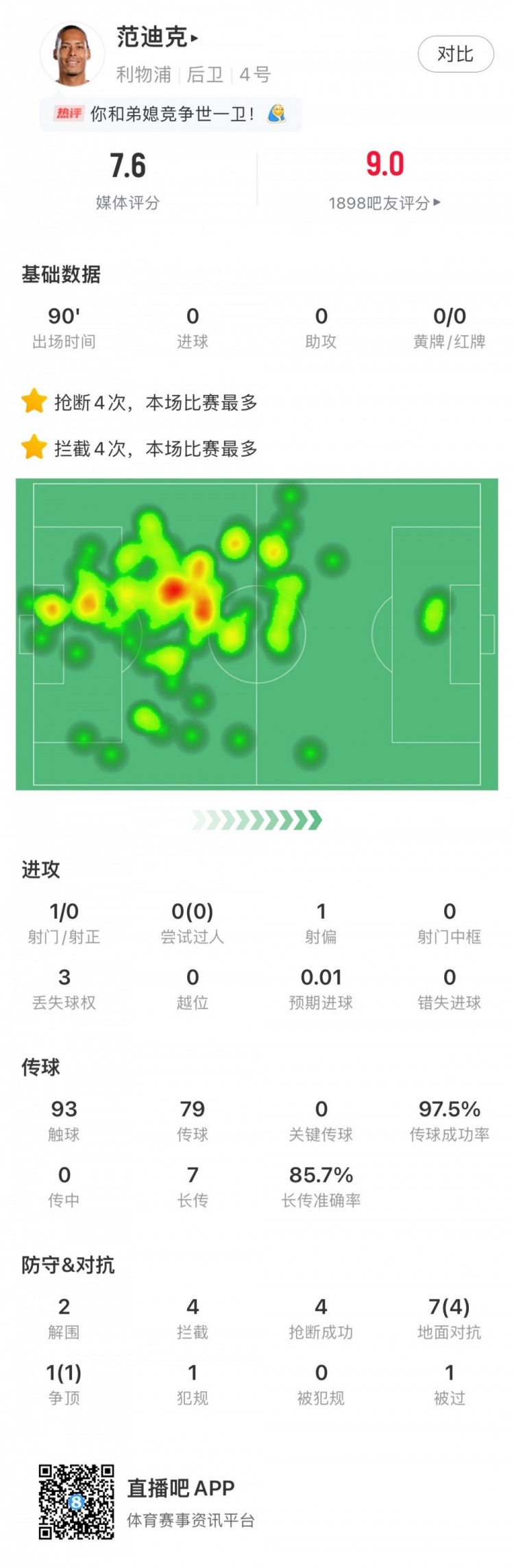 范迪克本场数据:2解围4拦截4抢断 传球成功率97.5%&评分7.6
