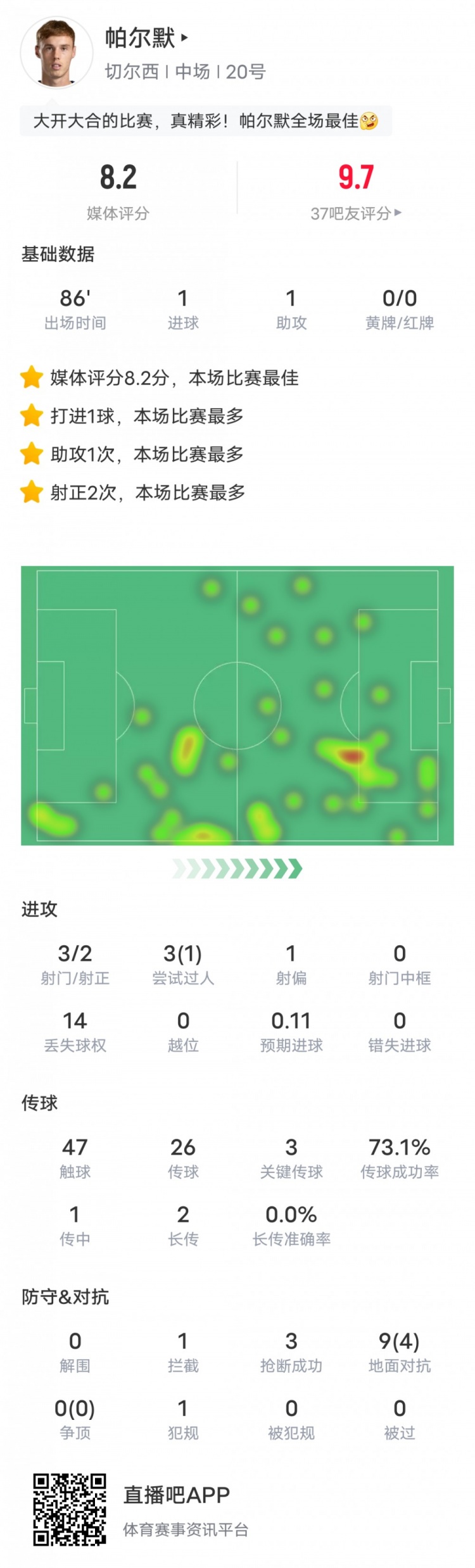 帕尔默本场比赛数据:传射建功&3关键传球 评分8.2全场最高