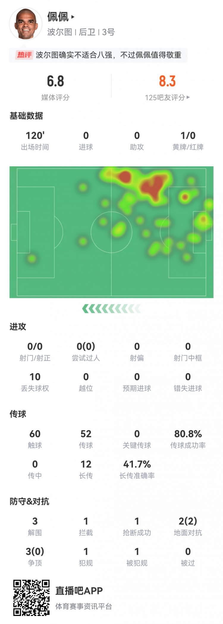 踢满120分钟!41岁佩佩本场数据:3次解围,1次封堵射门,评分6.8