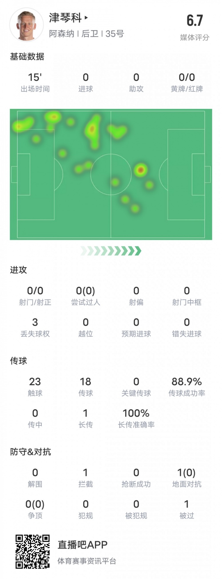 津琴科本场比赛数据:传球成功率88.9%&3丢失球权,评分6.7