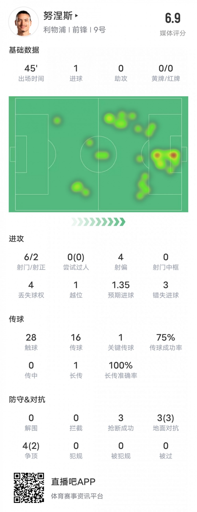 努涅斯本场比赛数据:1进球1关键传球4射偏3失良机,评分6.9