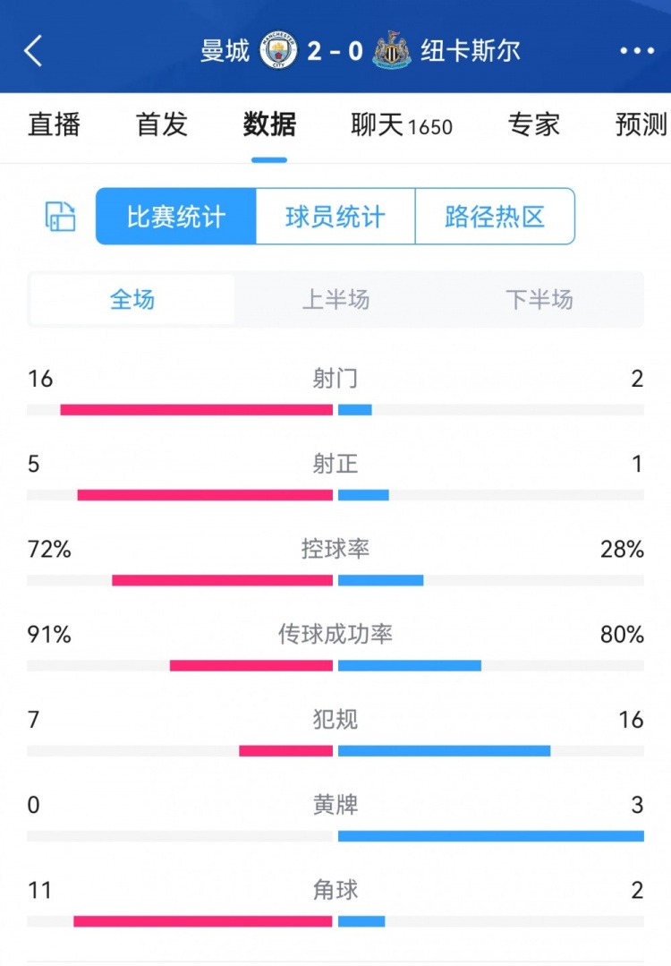 碾压!曼城2-0纽卡全场数据对比:射门16-2,射正5-1,角球11-2